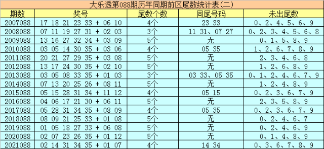 大乐透历年同期第088期后区尾数奇偶比为15:15,最近5年尾数奇偶比为5:5,后区尾数大小比为12:18,最近5年尾数大小比为6:4,本期后区注意号码04、06、09、10、11,后区两码关注04、11。