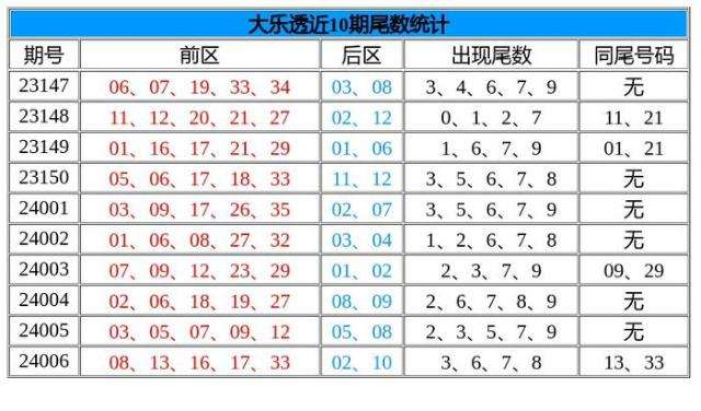 上期开奖:大乐透第24006期奖号为:08、13、16、17、33 + 02、10,开出尾数3、6、7、8,含同尾前区:13、33。