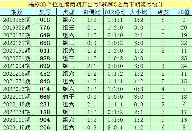 个位号码:最近两期个位开出号码为5-3,在福彩3D历史开奖中,前后两期个位分别开出号码5-3的奖号出现了79次。最近15期个位5-3组合出现之后,其下期奖号分别为:018-776-649-688-641-988-699-452-843-014-666-231-188-904-206;