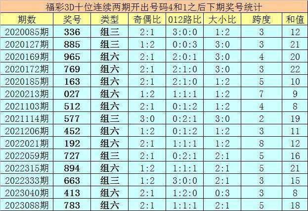 十位号码:前两期十位分别出现奖号4-1,历史上福彩3D连续前后分别开出号码4-1的现象共开出81次。在十位4-1的现象出现时,最近15期其下期分别开出号码:336-885-965-769-163-027-512-577-452-192-727-894-663-413-783;