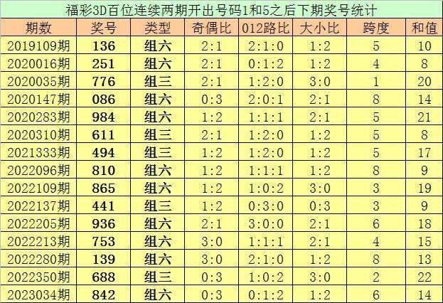 百位号码:连续两期百位出号分别为:1-5,历史上福彩3D连续两期前后分别出号1-5的奖号共出现84次。在百位1-5的奖号现象出现时,近15期下期分别出号:136-251-776-086-984-611-494-810-865-441-936-753-139-688-842;