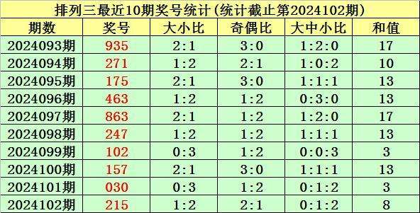 上期回顾:排列三第2024102期奖号为:215。奖号类型:组六,和值:8,奇偶比:2:1,跨度:4,大小比:1:2。