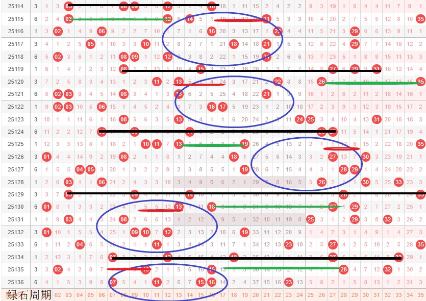 如图所示:体现的是3个局部走势的发展周期,圆圈为密集处的填空,本期定性为新局部走势第4期,架构填空第1期期主力填空第2期,绿色线界定17-28处,蛋跨界定07-17,本期蛋跨2-4枚布局,代表本期小号多开。