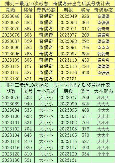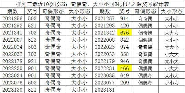 排列三最近10次同时开出奇偶形态:奇偶奇和大小形态:大小小时其奖号分别为:503-521-703-523-503-703-921-901-901-503-521,下期分别开出号码为:914-420-676-842-974-358-946-466-649-209,详细统计见下表: