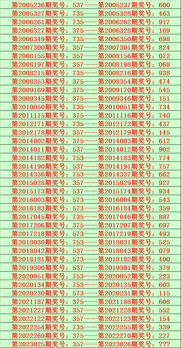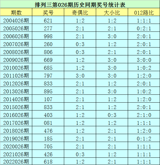 排列三第2023026期开奖日期:2023年2月5日,历史上第026期已开出了19次奖号,历年同期号码分别为:621、277、998、260、806、669、685、797、833、895、107、833、403、081、476、185、705、426、618。
