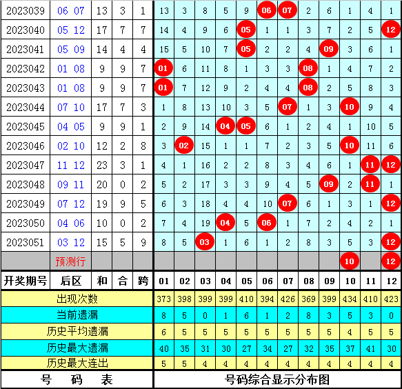 2、前区跨度分析:在第052期历史同期奖号中,前区跨度分布在12-34区段,分布比较广,其中跨度012路比为3:6:7,今年第052期预计开出1路跨度,精选跨度28。