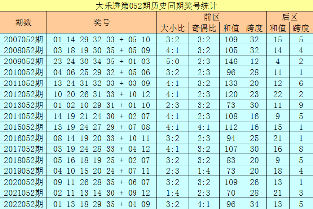 1、前区和值分析:在第052期历史同期奖号中,前区和值全部分布在70-146之间,和值大小比为12:4,奇偶比为8:8,最近三年同期和值开出109、70和96,今年第052期预计前区和值在70-79区段出现。