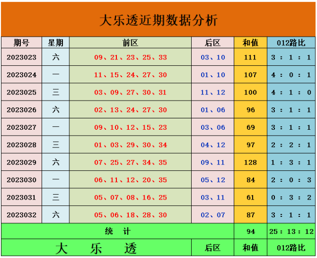 上期回顾:大乐透第2023032期奖号:前区05、06、18、28、30,后区02、07。前区奖号和值为87,三区比为2:1:2,后区开出小大组合02、07