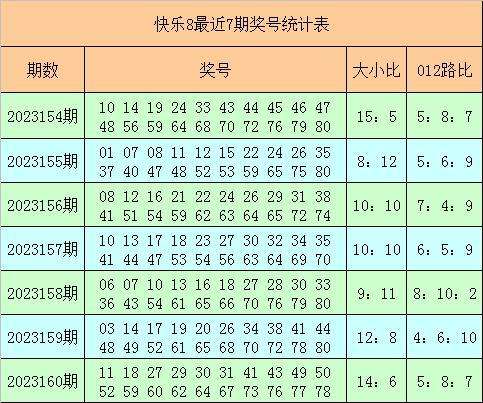 快乐8第2023160期奖号为:11 18 27 29 30 31 41 43 49 50 52 59 60 62 64 67 73 76 77 78,其中奖号012路比为5:8:7,大小比为14:6。