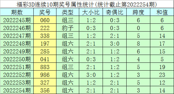 开奖回顾:福彩3D第2022254期奖号为356。奖号形态为组六,大小形态为小大大,奇偶形态为奇奇偶,和值为14,跨度为3。
