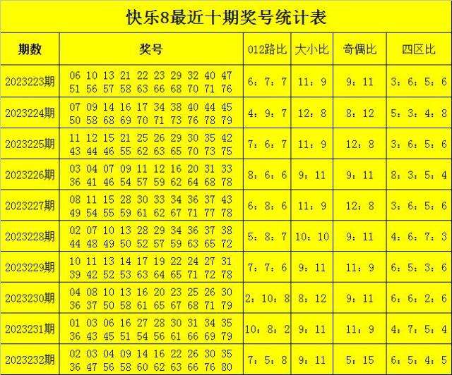 福彩快乐8第2023232期开奖回顾:02 03 04 09 14 16 22 26 30 35 36 47 56 58 60 62 63 66 76 80,其中奖号012路比为7:5:8,和值为765,跨度为78,奇偶比为5:15。