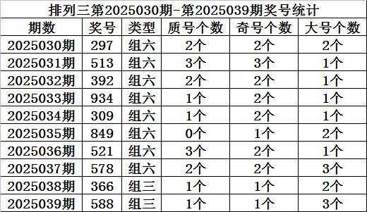 上期回顾:排列三第2025039期开奖:588,质合比为1:2,奇偶比为3:0,大小比为1:2。