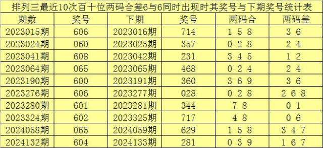 百十位合差分析:上期奖号百十位开出06组合,两码合为6,两码差为6,最近10次百十位两码合6与两码差6同时出现时,其奖号和下期奖号分别为: