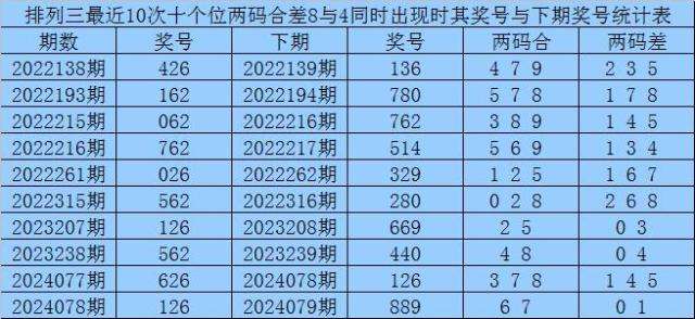 十个位合差分析:上期奖号十个位开出62组合,两码合为8,两码差为4,最近10次十个位两码合8与两码差4同时出现时,其奖号和下期奖号分别为: