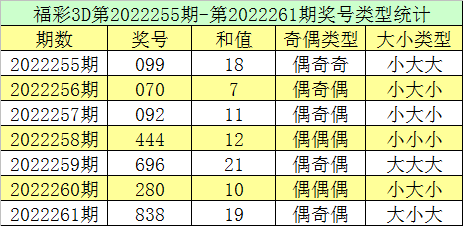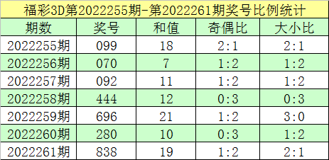 福彩3D第2022261期回顾:奖号为838,奖号奇偶比为1:2,大小比为2:1,和值为19,类型为组三。