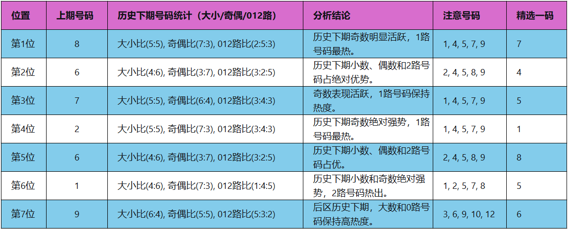 本期012路推荐比例:2:2:2,看好各路号码在本期实现均衡分布,重点关注偏冷的2路号码能否增强。