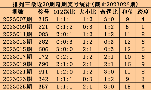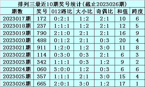 上期回顾:排列三2023026期奖号为665,奇偶比为1:2,大小比为3:0,跨度为17。