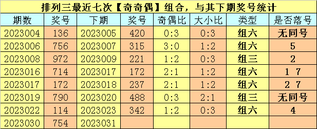 开奖回顾:排列三第2023030期开奖号码为:754。奖号类型为:组六,大小类型为:大大小,奇偶类型为:奇奇偶,包含重号:4。