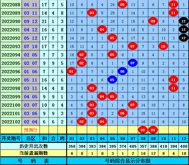 范闲大乐透第2022103期前区012路分析:上期前区012路比为1:1:3,2路奖号大热,最近7期前区012路比为10:15:10,1路奖号热出。