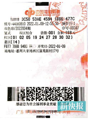新快报讯 记者陆妍思 通讯员李娜报道 1月9日,双色球第22004期开奖,当期广东中出2注614万多元一等奖,其中一注花落惠州市大亚湾西区富苑新村17号的44080810投注站,中奖彩票是一张168元“9+1”自选复式票,还同时中得三等奖18注、四等奖45注和五等奖20注,单票总奖金 620万元。这注一等奖是惠州彩市2022年的开门红,由10位彩民合买中得。次日,中奖者已火速兑奖喜迎新春。