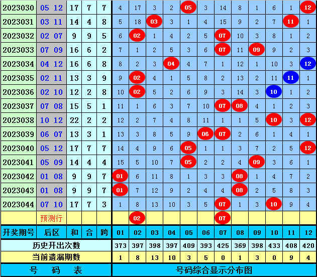 后区分析【一区01-04,二区05-08,三区09-12】:上期后区奖号为07和10,分别落在第二、三区,近50期后区三区比为29:34:37,近10期三区比为4:9:7,本期注意第一、二区号码出现,关注两码02+07。