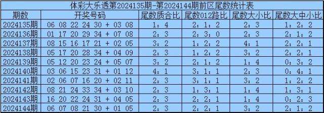 体彩大乐透第2024144期开奖号码为:06 07 08 21 30 + 01 05其中前区奖号奇偶比为2:3,大小比为2:3,012路为3:1:1,前区尾数质合比为2:3,012路比为2:2:1,大小比为3:2,大中小比2:1:2。