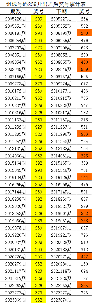 从上表可以看出,组选号码239开出之后,出现次数最多的三个号码分别为:247,本期防这三码中落号;出现次数最少的三个号码分别为:961,本期预计这三个号码不会同时出现,本期杀一码:9。