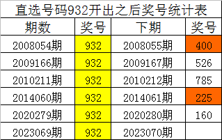 从上表统计可以看出,直选号码932开出之后,其下期奖号: