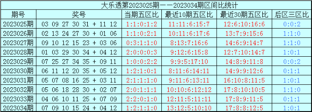 最近100期前区五区比为120:95:96:108:81,最近30期前区五区比为40:31:20:38:21,最近10期前区五区比为13:12:5:10:10,上期前区五区比为1:2:1:1:0。
