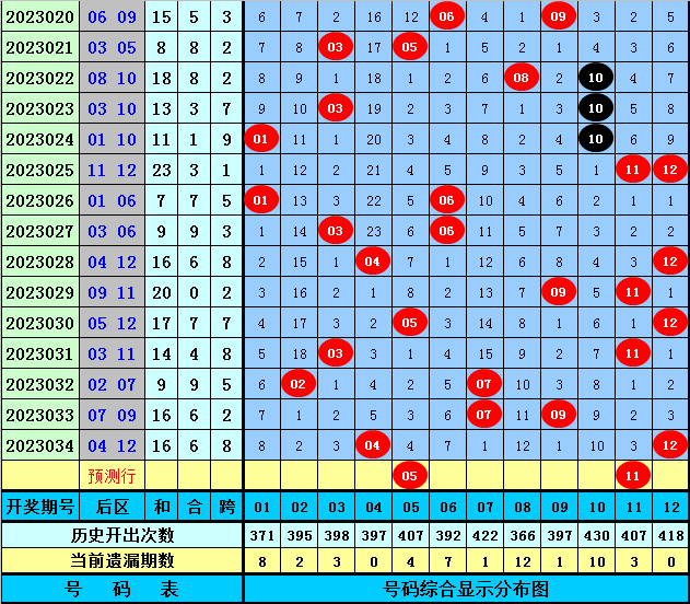 后区上期开出奖号:04和12,分别出现在一、三区,最近5期三区比为3:3:4,本期注意第一区号码走冷轮空,出号大范围参考05、06、08、09、11,精选两码05、11。