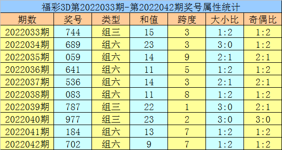 开奖回顾:福彩3D第2022042期开出奖号702。奖号形态为组六,奇偶比为1:2,012路比为1:1:1,大小比为1:2,和值为9,跨度为7。