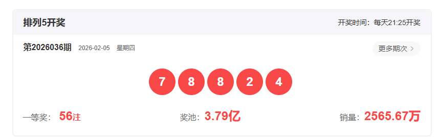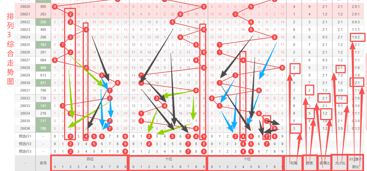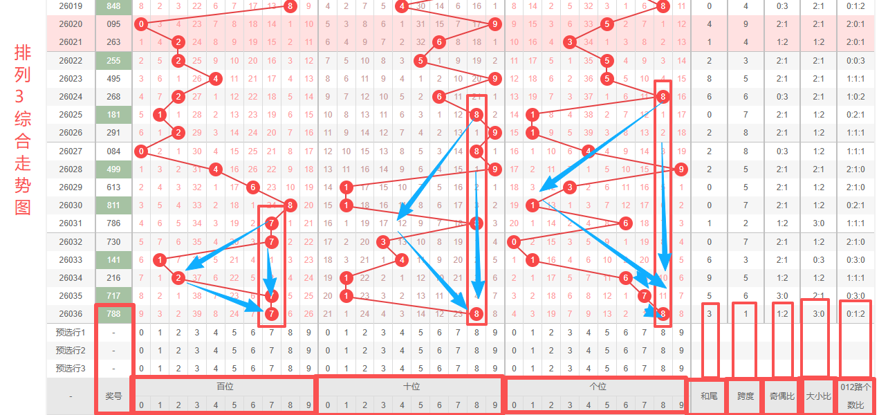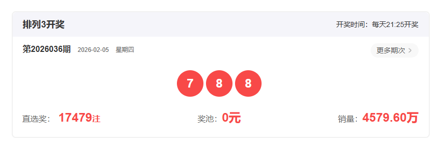 体彩排列3第2026036开奖号码788,形态为组三,奇偶比1:2,和值23,跨度1,大小比3:0,【012】路个数比0:1:2。