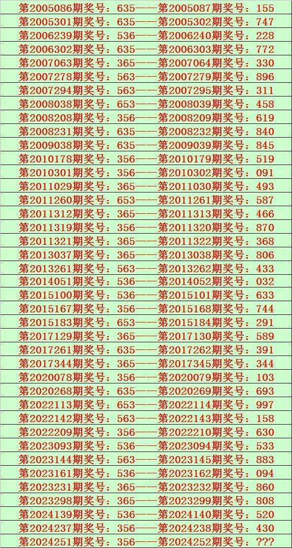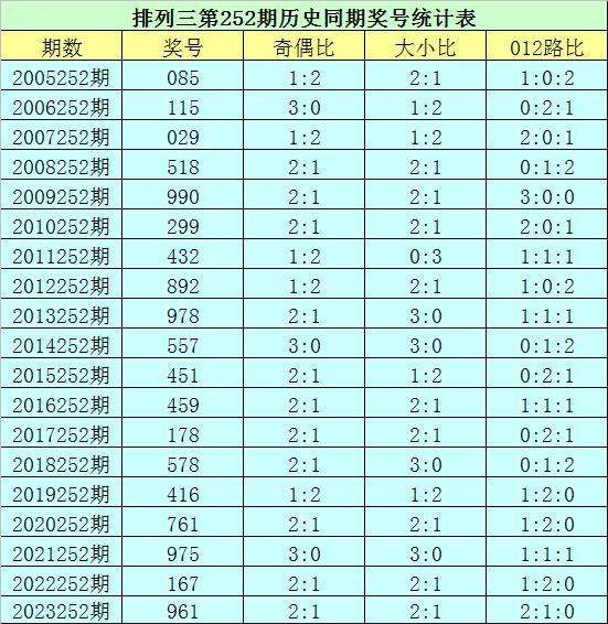 排列三第2024252期开奖日期:2024年9月18日,历史上第252期已开出了19次奖号,历年同期号码分别为:085、115、029、518、990、299、432、892、978、557、451、459、178、578、416、761、975、167、961。