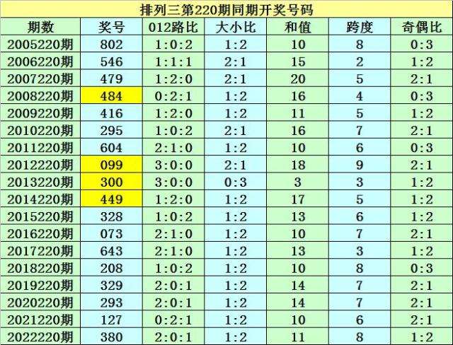本期为排列三第2023220期开奖,开奖日期为:2023年8月18日,历史上排列三第220期已开出了18次奖号,历年同期开出号码分别为:802-546-479-484-416-295-604-099-300-449-328-073-643-208-329-293-127-380。