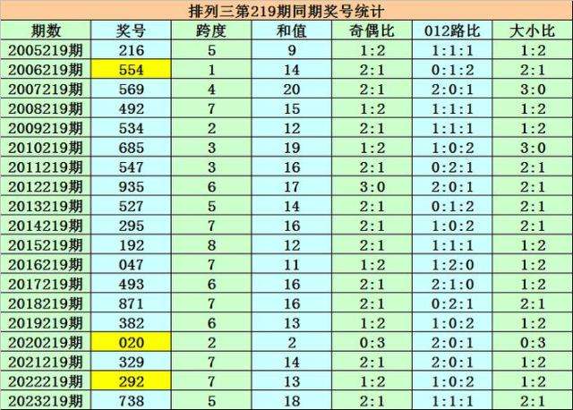 号码大小比:第220期历史同期奖号大小比为21:33,其中大小比1:2开出13期,2:1开出4期,3:0开出0期,0:3开出1期,本期参考大小比1:2。