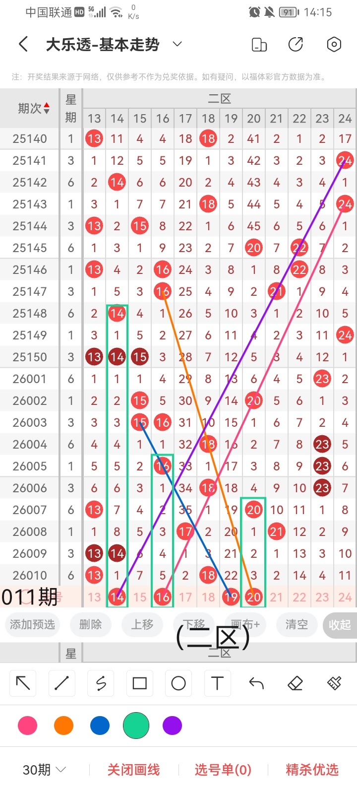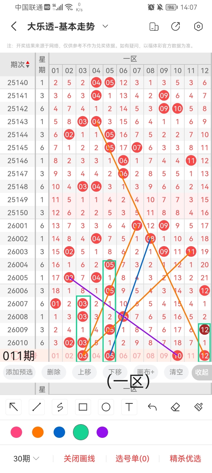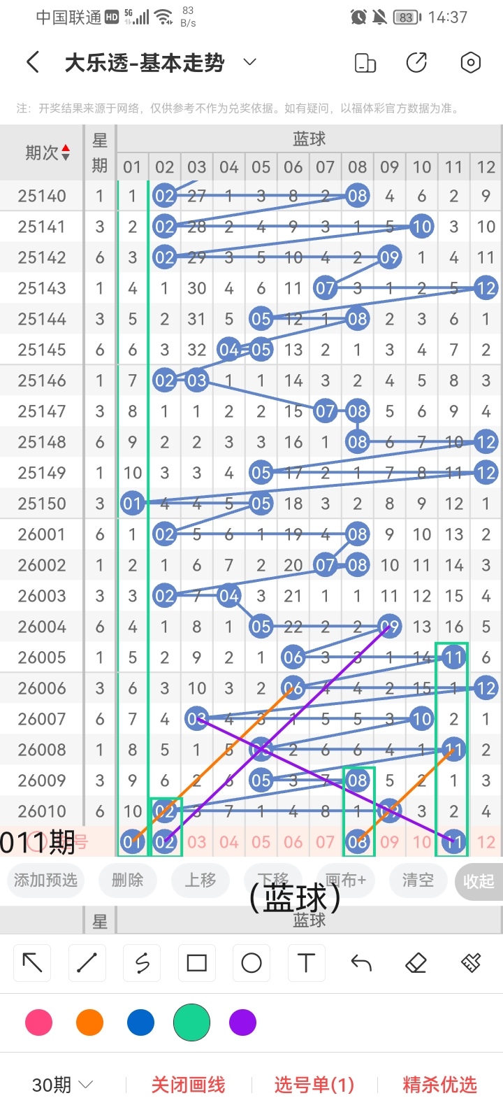 小梁根据上图中画线的思路分析得出,最后给大家汇总一下大乐透本期红球、蓝球数据,供大家参考: