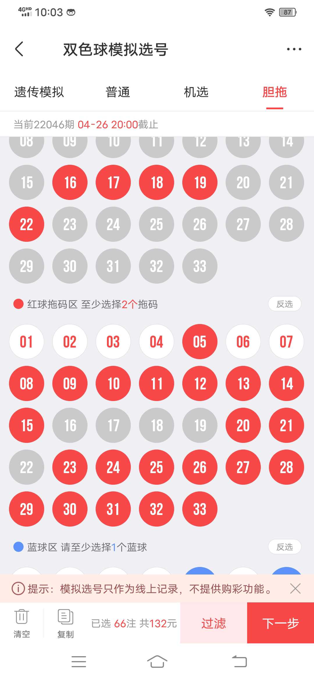 22045期双色球红球开03 12 17 18 19 28,和值为97,大小比4:2,奇偶比3:3,质合比3:3。十拿九稳福彩双色球第2022046期红球预测: