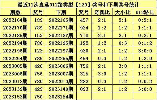 排列三上期开出奖号为:750,其直选012路类型为120,历史上直选120号码已开出了223次,最近11期分别开出奖号为:189、789、153、780、123、786、420、756、780、429、750。