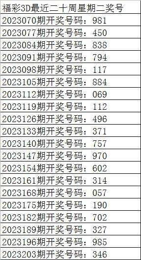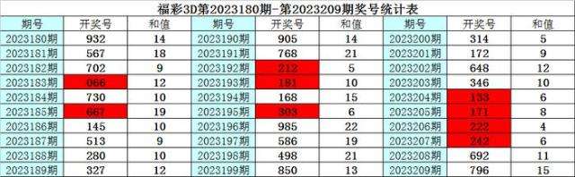 上期回顾:福彩3D第2023209期奖号为:796,其中奖号组选类型为:组六,奇偶比为2:1,大小比为3:0,012路比为2:1:0,和值为22,跨度为3。