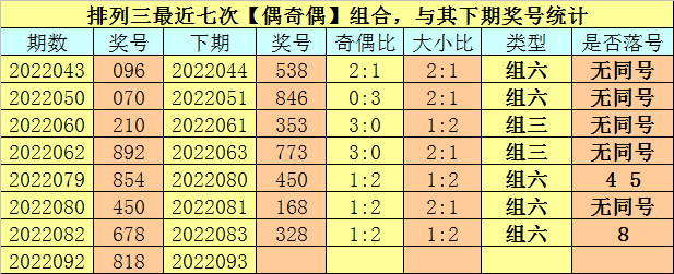 奇偶分析:排列三上期奖号为818,其奇偶类型为【偶奇偶】,最近七次出现奇偶类型偶奇偶的号码分别为:096、070、210、892、854、450、678,其下期奖号分别为:096、070、210、892、854、450、678。其中号码奇偶比为11:10,奇偶奖号开出比例基本平衡,本期看好偶数号码转热,注意奇偶比1:2出现。
