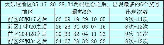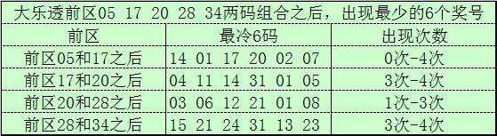 前区冷码统计:大乐透第24138期前区奖号为:05、17、20、28、34,截止第24138期历史上大乐透已经开出了2654期奖号了,在连续两码奖号中: