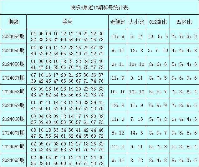 福彩快乐8第2024063期开出奖号:02 05 06 07 11 12 14 17 24 30 36 38 51 56 60 61 67 71 73 78,其中奖号奇偶比为9:11,大小比为8:12,012路比为8:4:8,四区比为8:4:3:5。