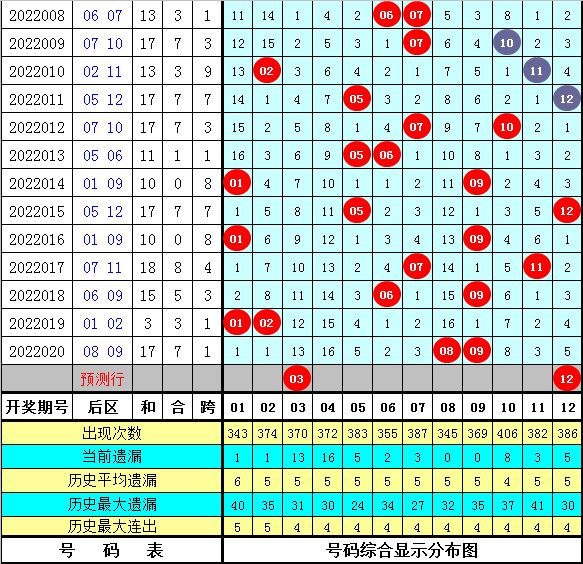 3。出号统计:所有奖号都出现了,其中09号码开出次数最多,为6次。