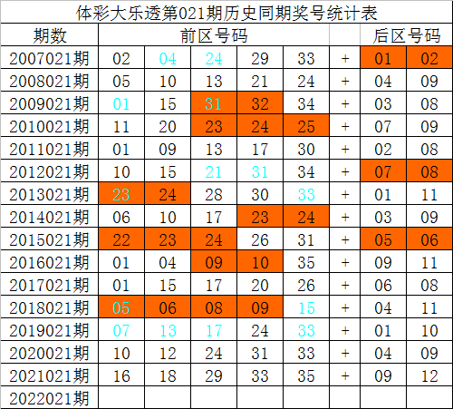 体彩大乐透第021期历史上已开出了15次,其奖号分别为:
