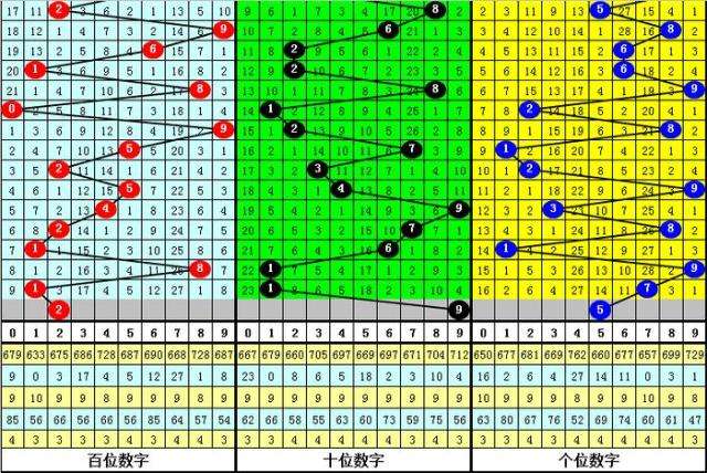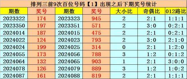 在百位前9次出现号码1之后,下期百位分别开出奖号:9-5-4-7-3-7-9-8-8,其中开出号码个数大小比是7:2,012路比是3:3:3,奇偶比是6:3。