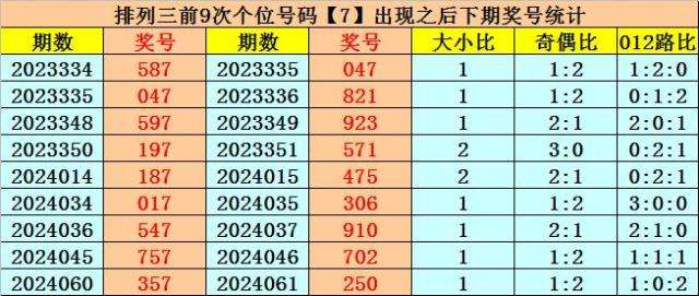 个位前9次开出号码7时,该位下期奖号分别为:7-1-3-1-5-6-0-2-0,其中号码个数奇偶比是5:4,大小比是3:6,012路比是4:3:2。