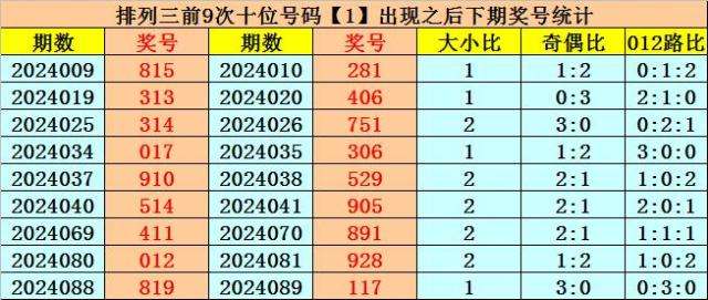 在十位前9次出现号码1后,其下期奖号分别开出:8-0-5-0-2-0-9-2-1,其中奖号个数奇偶比是3:6,大小比是3:6,012路比是4:1:4。