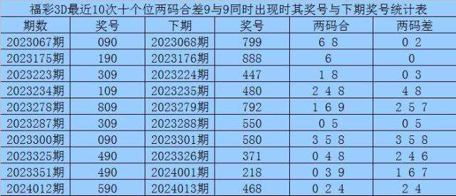 百个位合差分析:上期奖号百个位开出09组合,两码合为9,两码差为9,最近10次百个位两码合9与两码差9同时出现时,其奖号和下期奖号分别为: