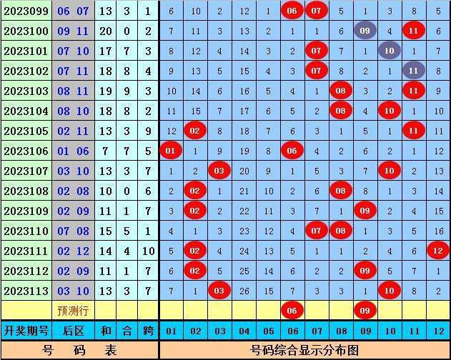 后区分析:后区上期开出奖号03和10,号码遗漏期数为:5期、5期,本期防后区重号出现,后区大范围参考01、03、06、09、10。