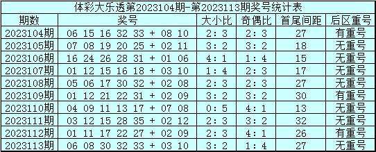 体彩大乐透第2023113期开出奖号:06 08 30 32 33 + 03 10,其中前区奖号大小比为3:2,奇偶比为1:4,首尾间距为27